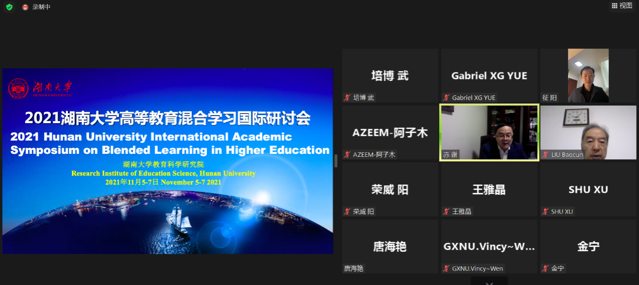 2021年11月5-7日,湖南大学高等教育混合学习国际学术研讨会通过ZOOM在线召开,我院特聘教授岳晓光受邀参加并做了关于在线教育的学术报告。