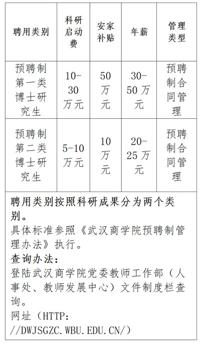 武汉商学院为新招聘的人员办理聘用手续,实行合同管理,并按合同约定及国家、省、市有关政策规定及《武汉商学院预聘制管理办法》执行薪酬待遇。